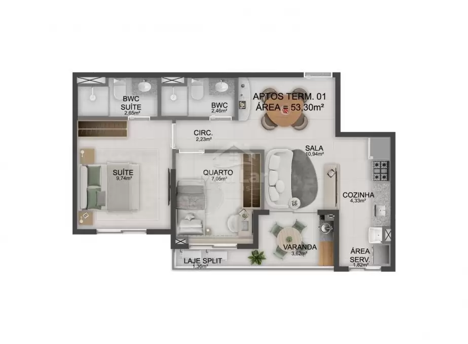 - Apartamentos de 2 quartos sendo 1 suíte (53,30 m²)